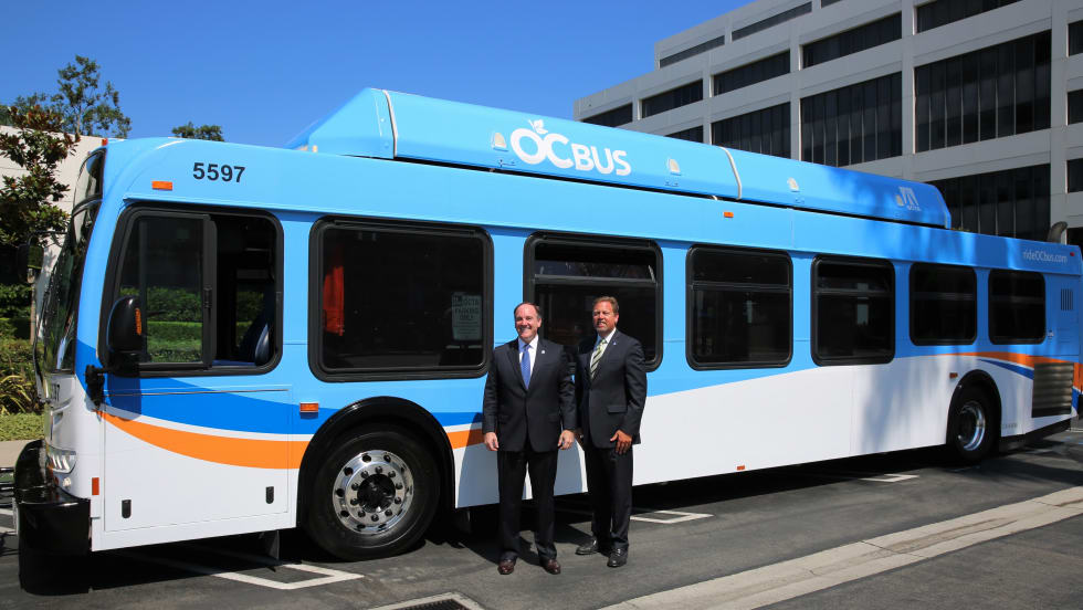 The existing design, more than 20 years old, will be phased out to make way for the new look that prominently features a light blue and orange wave across the bus and the words “OC Bus.”