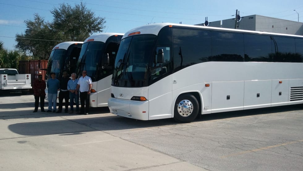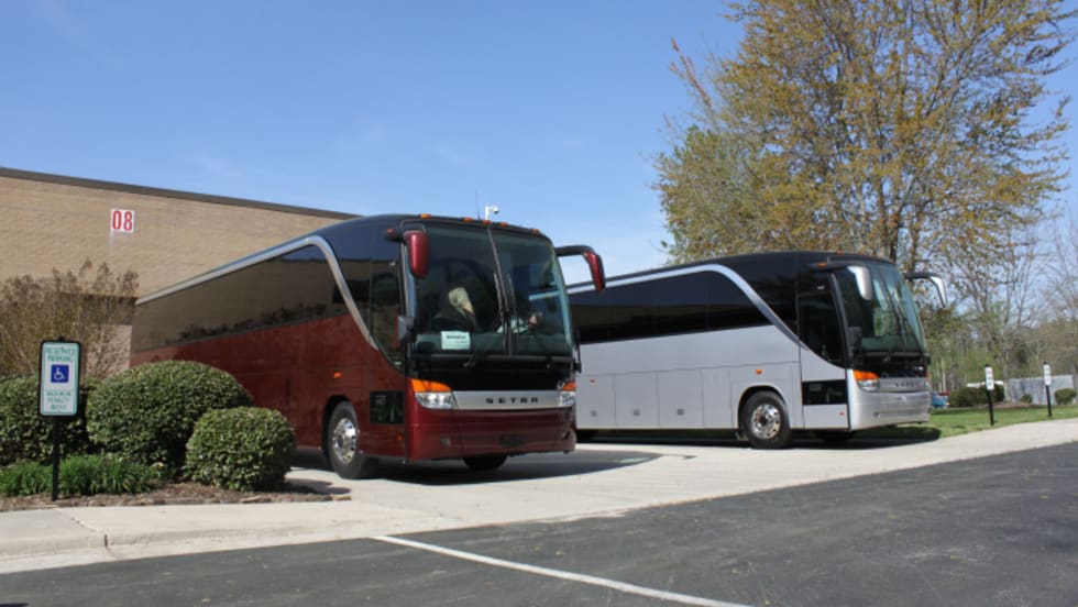 The 57-passenger coaches are powered by Detroit Diesel's new DD13 engine mated to Allison transmissions and equipped with Alcoa Durabrite aluminum wheels, chrome mirrors, backup cameras and three-point seat belts.