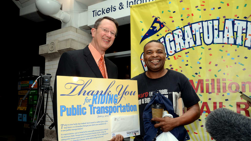The daily DART Rail rider, Don Johnson, was greeted by DART President/Executive Director Gary Thomas and Michael Melaniphy, president/CEO of APTA.