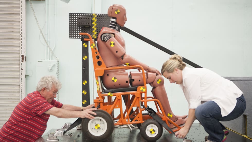 To comply with the new voluntary industry standard known as WC18, wheelchair tiedowns or other securement devices must pass two different dynamic strength tests.