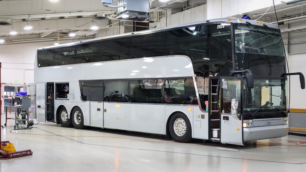 The repowered Van Hool TD925 double-decker bus is equipped with a 640-kWh battery, the largest known to exist for a vehicle of its type.