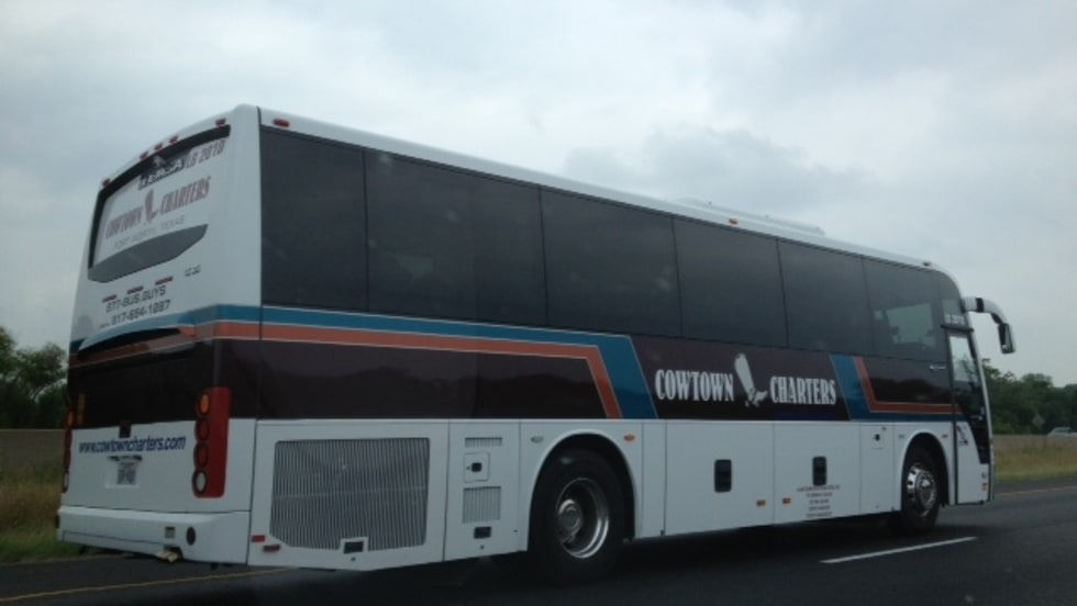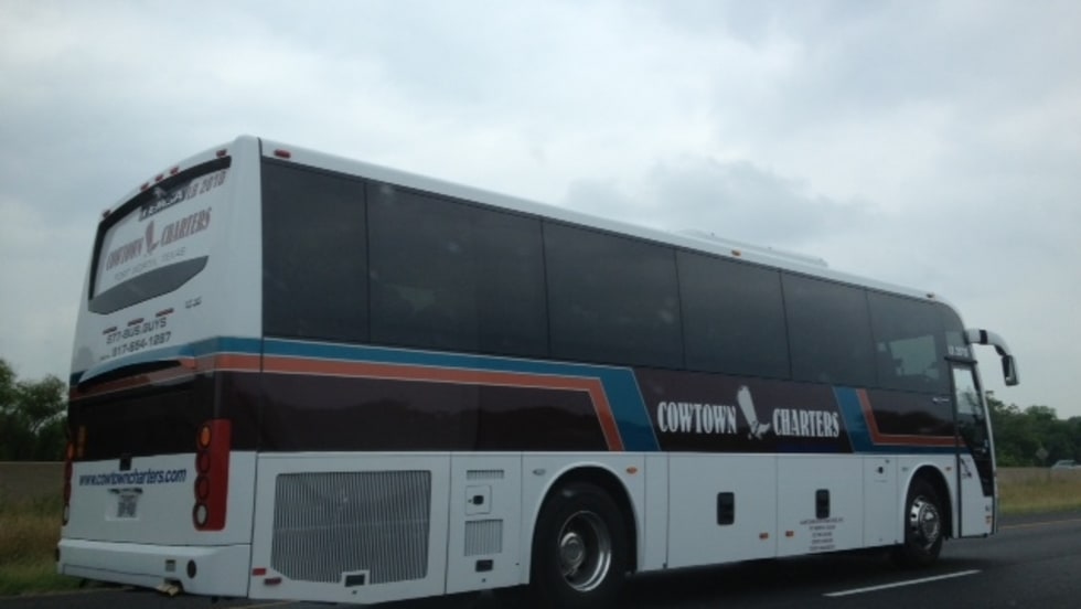 The Cowtown Bus Charters Inc. coach is equipped with REI Audio/Video, Alcoa rims, side and driver shades, and 110-volt plug outlets.