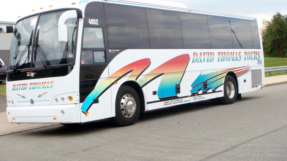 Coaches are equipped with a Cummins ISL 345 HP engine, Allison B500 transmission and three-point seat belts. The David Thomas Tours coach is also equipped with REI audio/video, Alcoa rims and 110-volt plug outlets.