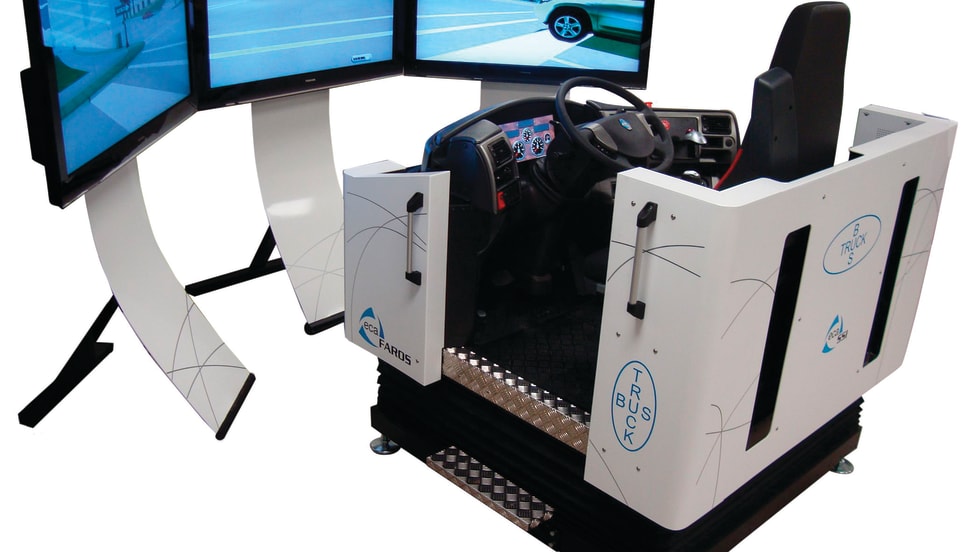 The EF Truck/Bus driving simulator utilizes OEM automotive components including a full-size steering column, wheel and hand controls, dashboard, shifter, pedals and lifelike graphics to generate an authentic simulation experience.