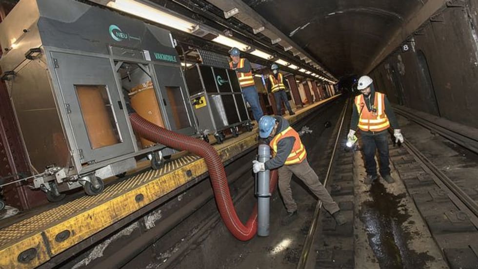 Commuter rail operator utilizing power washers and drones to reduce impact of slippery rail created by leaves, debris on tracks.
