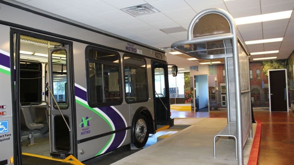 A full-size bus and bus shelter are part of the indoor landscape, as well as varied pavement and ground applications. Input on the development of the Mobility Center was considered by a paratransit technical advisory committee and a regional paratransit stakeholders group.