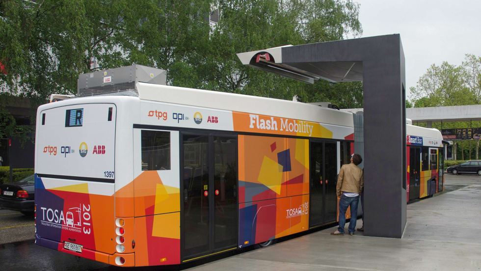 When the bus pulls up to a stop, a battery on the rooftop automatically jumps up to the overhead charger, hooks in, and charges. After the first bus was tested in Geneva, the city committed to replace an entire line with the technology.