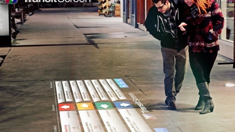 In addition to the real-time transit data provided by the screens, the projections would also embed way-finding information for transit options on sidewalks, walls, plazas, or even billboards.