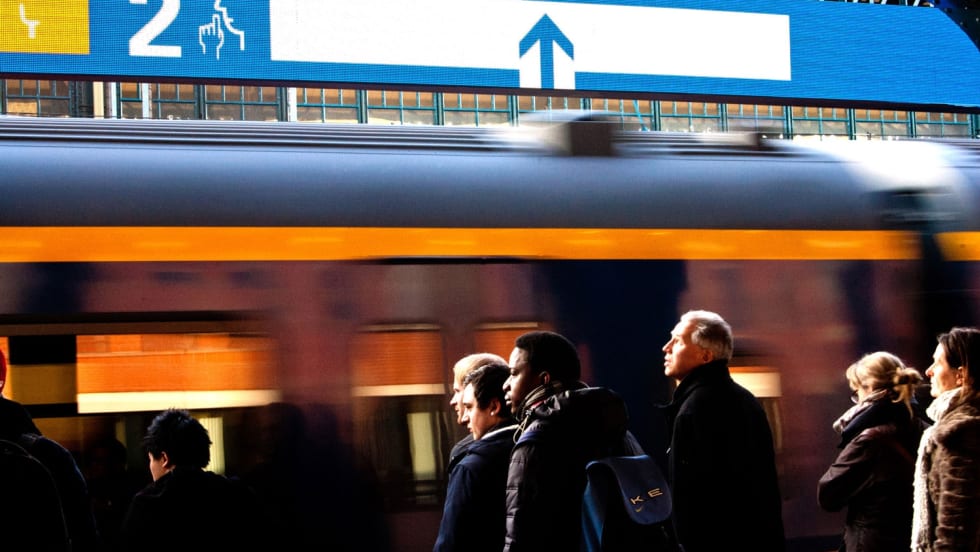 A 590-foot-long LED screen that hangs above the train platform uses intuitive color-coding and symbols to show exactly where to stand to make boarding easier once the train arrives