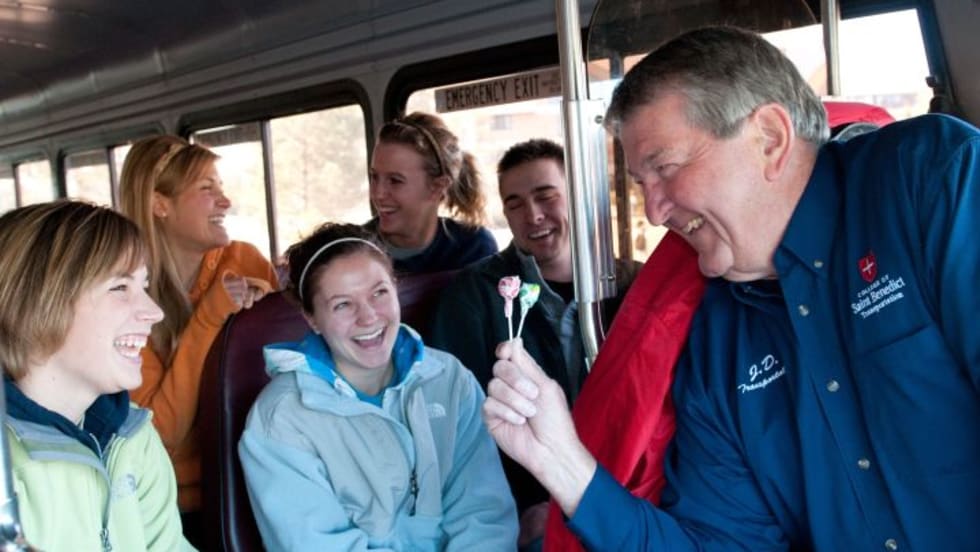 Retired executive drives students between the College of Saint Benedict and Saint John’s University, two Catholic liberal arts colleges located about 5 miles apart near St. Cloud, Minn.