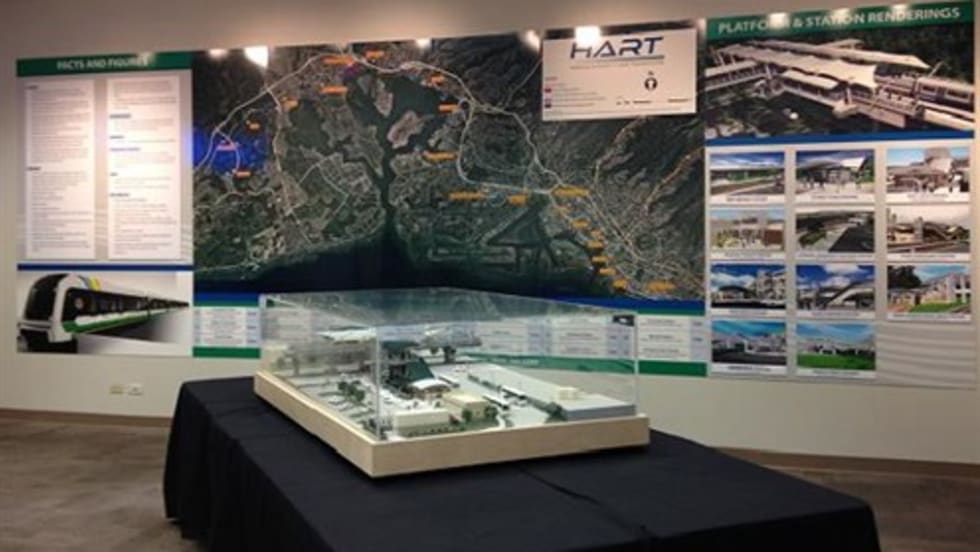 The permanent display will be updated regularly and features an aerial map of the 20‐mile route and 21 rail stations, the latest renderings of rail stations along the first 10 miles of the route, and facts and figures on the rail system.
