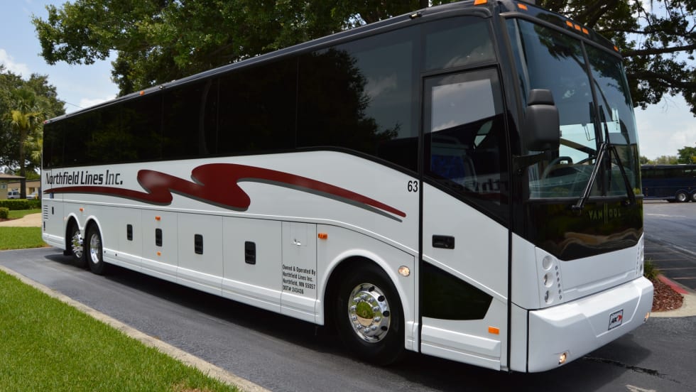 The 56 passenger coaches come with Van Hool's standard safety features including Kidde fire suppression, Smartwave tire monitoring, automatic traction control, lane departure warning and a backup camera.