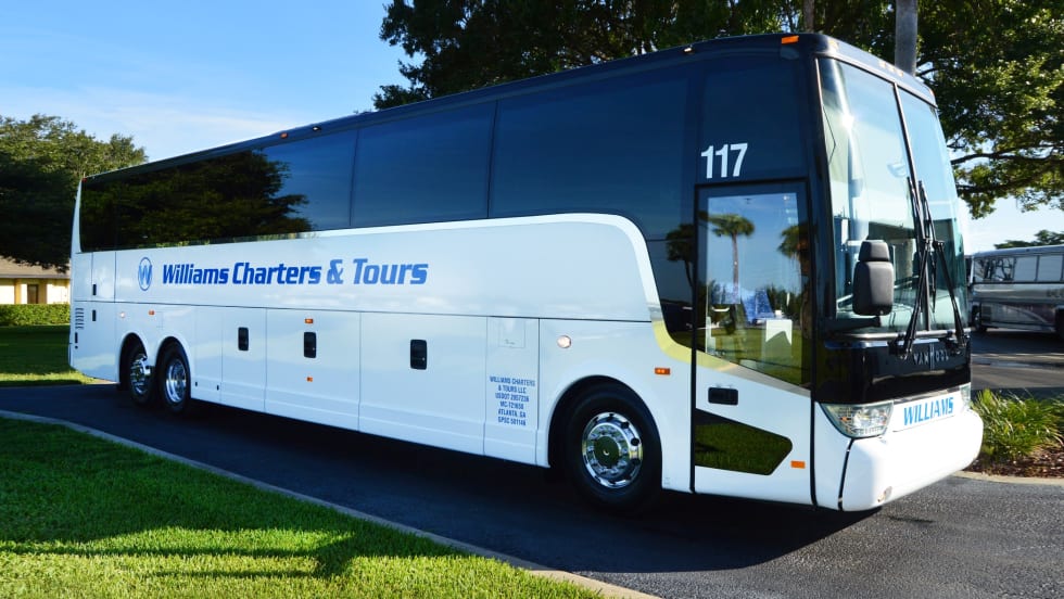 The new Wiliams Charters and Tours coaches include several safety features, including three-point seatbelts, backup cameras, lane departure warning, anti-lock brakes and Smartwave Tire Pressure Monitoring.