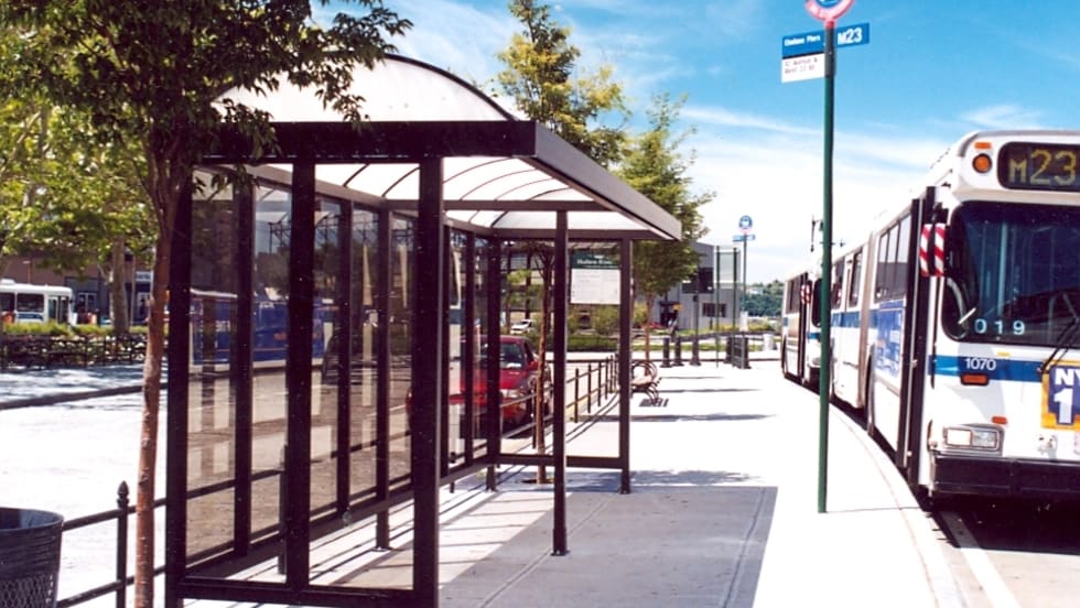 The "Simme" is a good solution that maximizes space by offering seating for two customers, as well as incorporating the bus stop sign and route schedule.