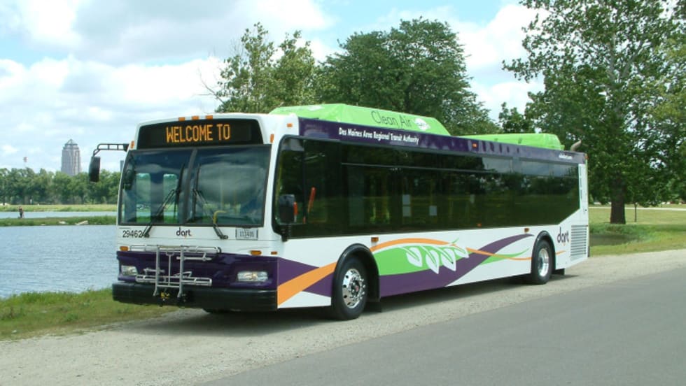 The new Orion VII hybrid-electric diesel bus features LaFrance eco-friendly fabric made of recycled materials on the passenger seating, a video surveillance system, a bike rack, and tip-in windows for improved circulation and passenger safety.
