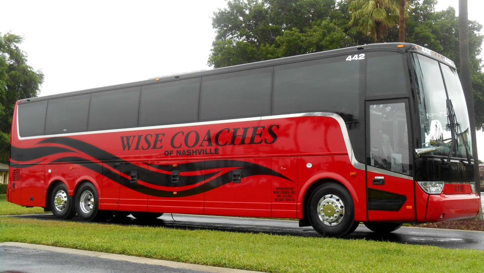 The distinctive red and black coaches for Wise Coaches are equipped with a REI Elite entertainment system, including five 22-inch LCD monitors mounted in Van Hool's exclusive contoured parcel racks.