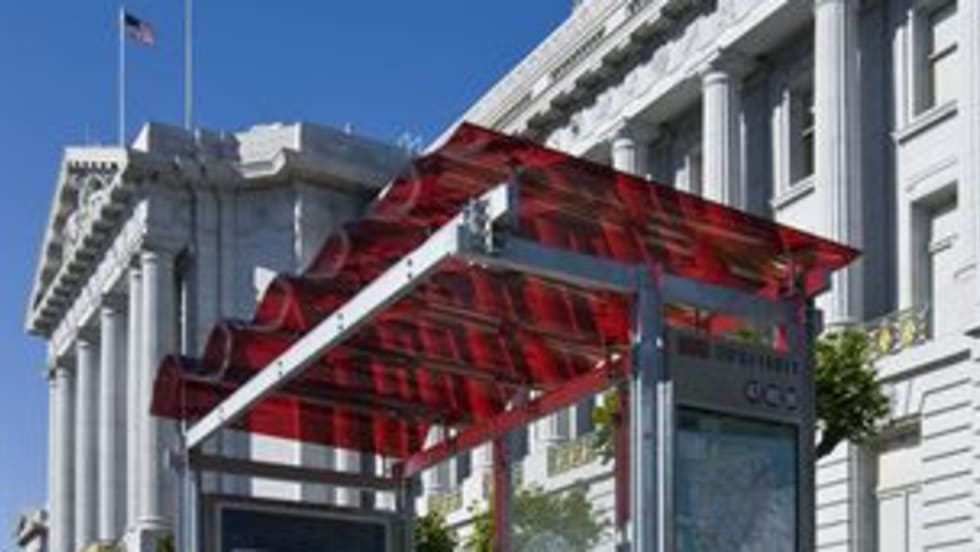 Some of the new transit shelters will use third-generation organic-dye-based photovoltaic solar film to power the shelter lights and information systems. The structures of the new shelters use steel with high-recycled content as well as energy-efficient LEDs.