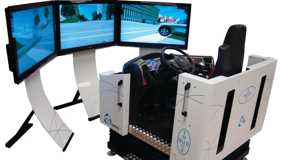 The EF Truck/Bus driving simulator utilizes OEM automotive components including a full-size steering column, wheel and hand controls, dashboard, shifter, pedals and lifelike graphics to generate an authentic simulation experience.