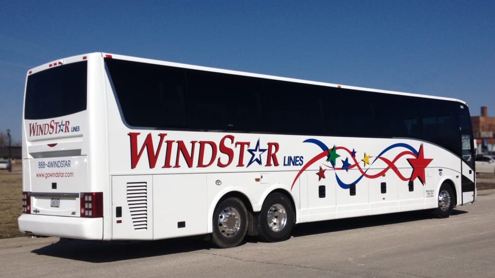 The coach features Alcoa Durabright wheels, chrome mirrors and an ASA back up camera. Like the rest of Windstar’s fleet of luxury coaches, it has a multi-monitor DVD system, Hi-Fi Audio and CD player, and a full fabric interior.