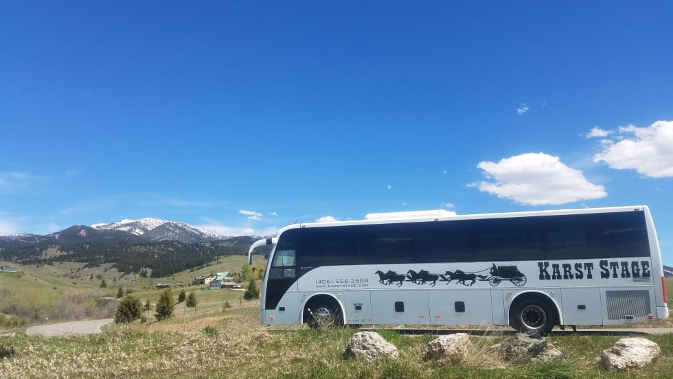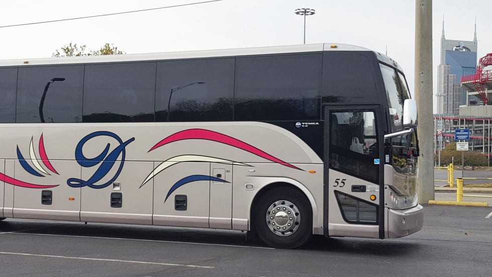 The new coach is equipped with Alcoa wheels, 110-volt outlets, ample underfloor luggage space, three-point seat belts, and a Cummins/Allison powertrain.