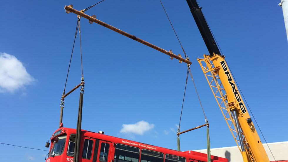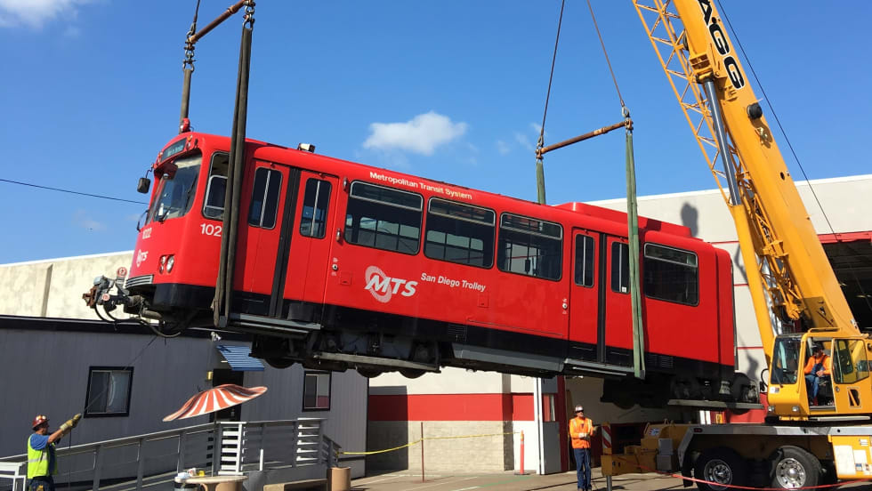 The Siemens vehicles, which weigh about 80,000 pounds each, were cut in half, hoisted by crane and strapped down to flatbed trucks for their 1,300-mile trip.