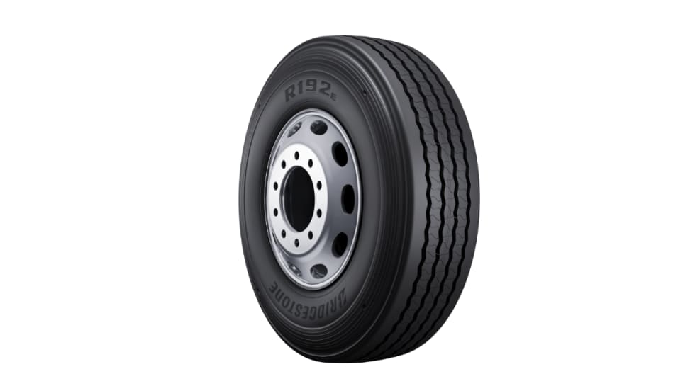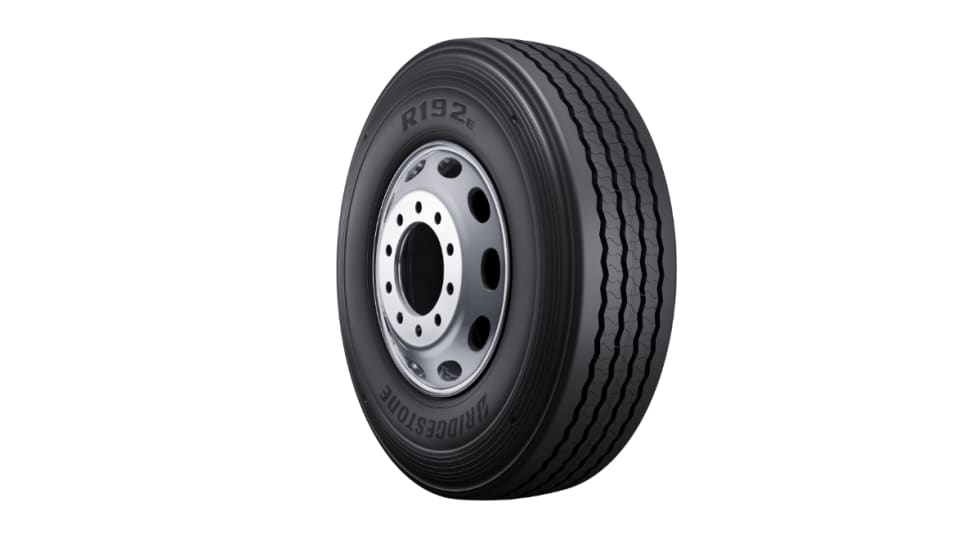 The Bridgestone R192E tire offers rolling resistance and high load capacity.
