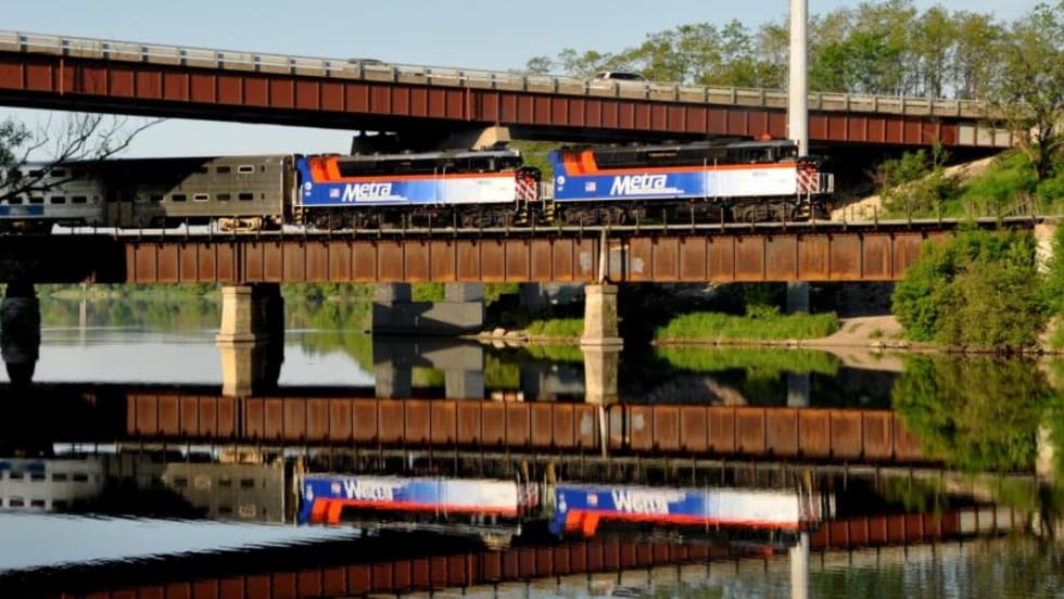 The bridge is situated over the Fox River along the Milwaukee District West Lake in Elgin, Ill.