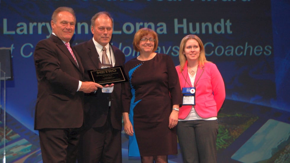 METRO VP, bus, rail/Publisher Frank Di Giacomo presented the award to the Hundts, who were joined by their daughter Michelle Hundt Tupman, director, tour operations, at the United Motorcoach Association’s Expo at Travel Exchange in Los Angeles.