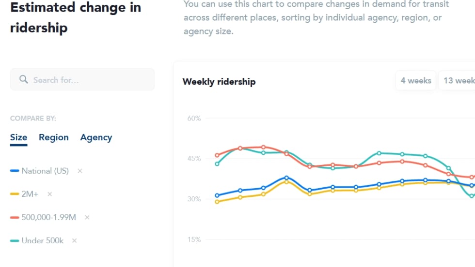 Transit’s team also analyzes route-level and system-wide origin-destination data, to provide transit agencies with up-to-date information about rider demand in its Transit Dashboard.