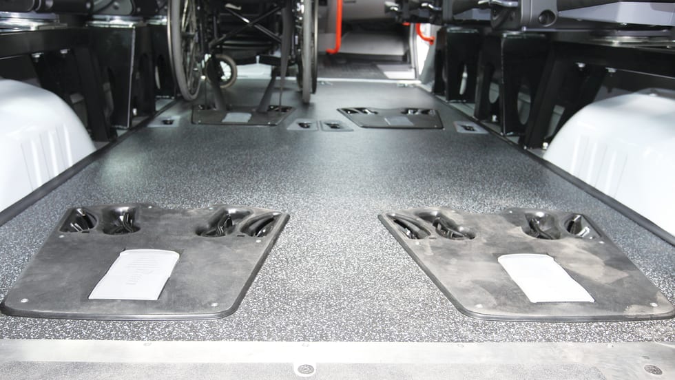 AMF-Bruns’ PROTEKTOR wheelchair and occupant restraint system provides critical stabilization for passengers in the event of a collision, while The Hideaway system features restraints that are fully-integrated into the floor, which frees up valuable floor space and increases passenger capacity.