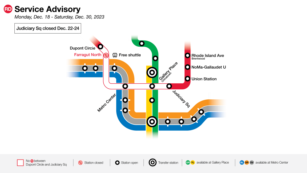 During construction, Red Line service will be unavailable at Farragut North, Metro Center, and Gallery Place stations with free shuttle buses replacing trains from Dec. 18 through Saturday, Dec. 30.