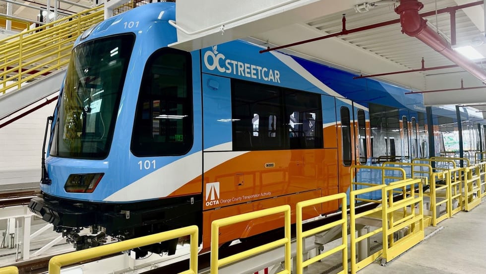 The vehicle, manufactured in Sacramento, Calif., is the first of eight to be delivered for the OC Streetcar.