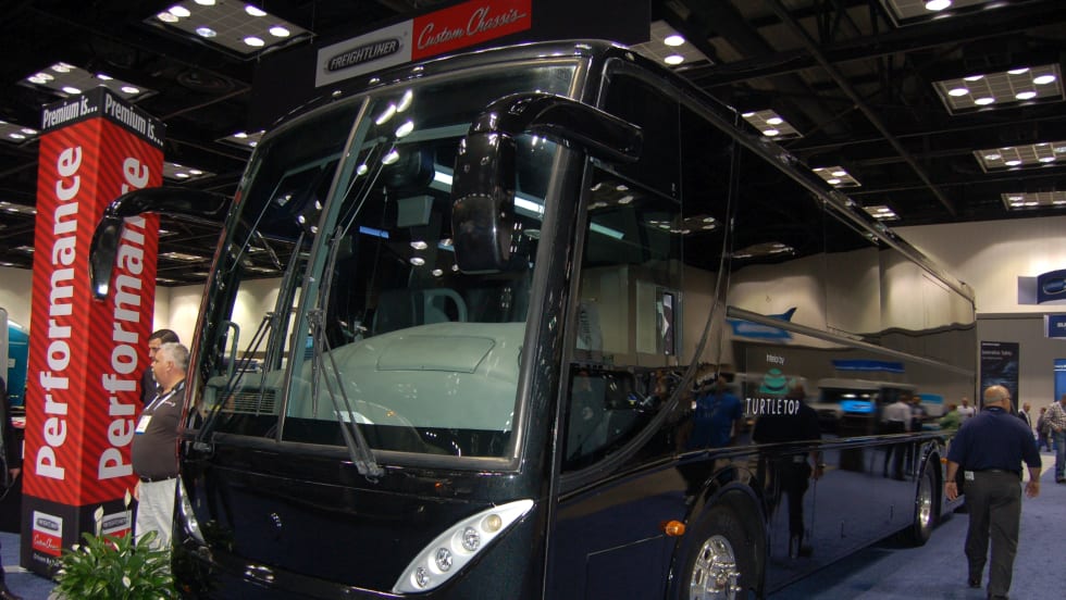 Freightliner’s chassis featured several chassis around the show floor, including a collaboration with Caio and Turtle Top for a G3400 motorcoach with an XBR raised-rail, rear-engine chassis.