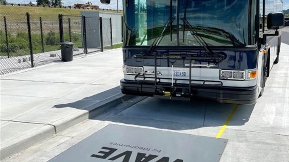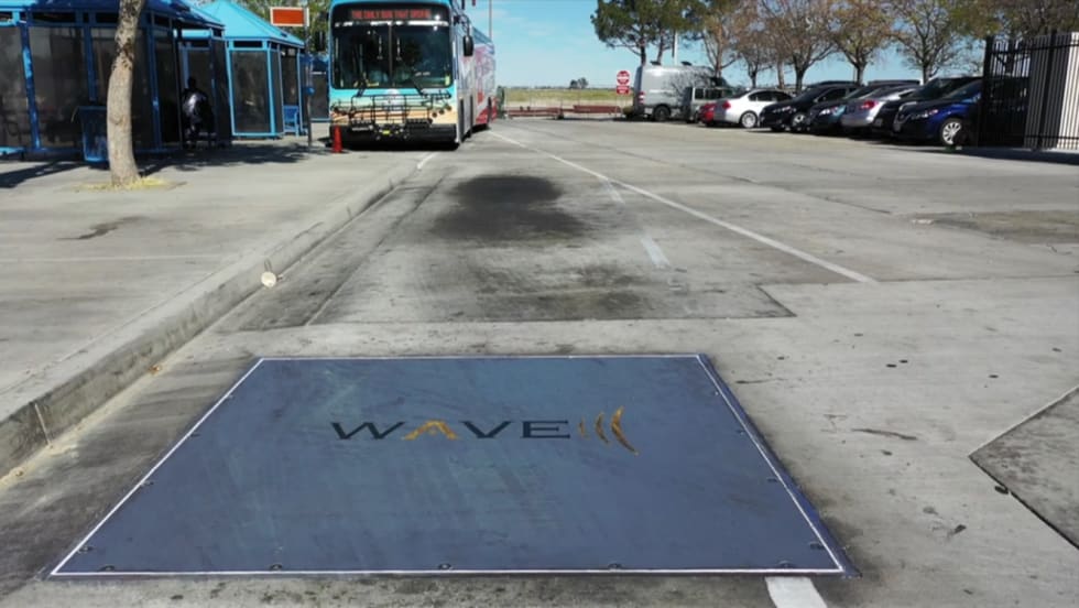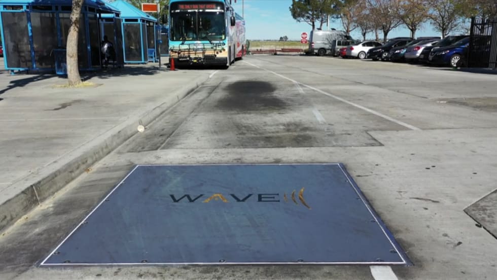 The new WAVE wireless charging station includes a primary charging plate aimed at reducing wait time for electric buses to be fully charged.