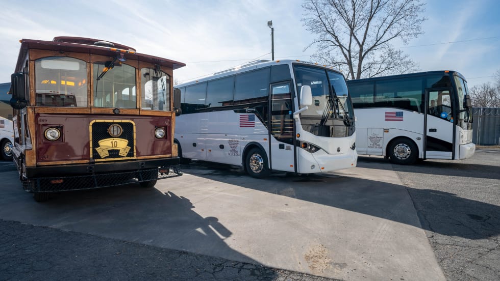Each of First Class Charter’s new coaches feature tasteful interiors with such amenities as reclining seats, in-motion satellite television, 110-volt outlets, and backup cameras.