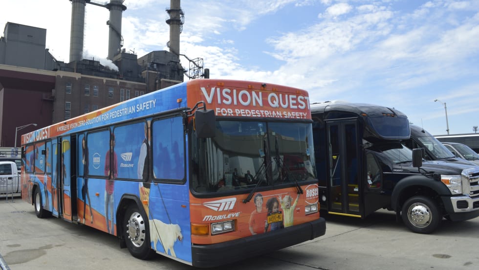 The Mobileye Shield+ System is a multi-vision-sensor system that uses algorithms to determine whether a pedestrian or bicyclist near the vehicle is a threat and alerts the driver with an audible and visual alert.