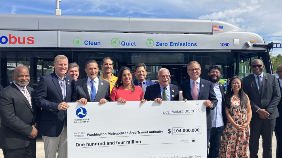 The grant was delivered at a celebration at the Cinder Bed Road Bus Garage which will be converted to exclusively serve battery-electric buses with funds from the grant.