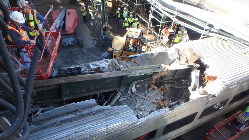 The slow-speed derailment of the three middle cars happened as train 3926 from Trenton rolled onto Track Nine in the station at about 9 a.m. The impact was hard enough to break a wheel off of one of the cars.