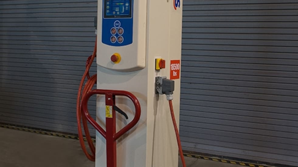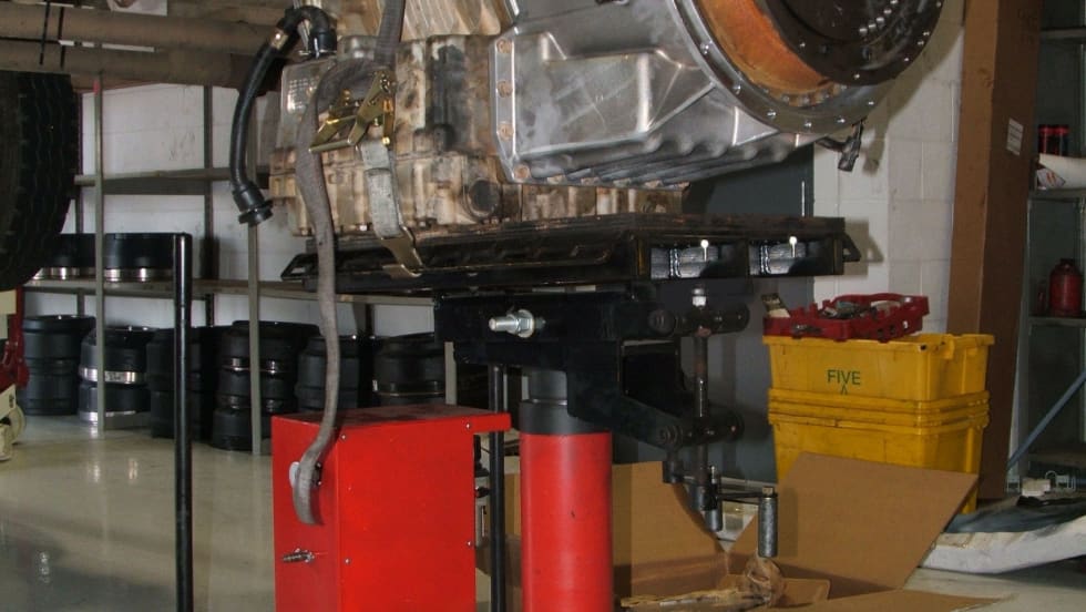 The battery-operated jack can be charged overnight and used without cables. The pneumatic jack has an attached air hose to keep it working. Previously, transmission jacks were manually hand-pumped, much like a car jack.