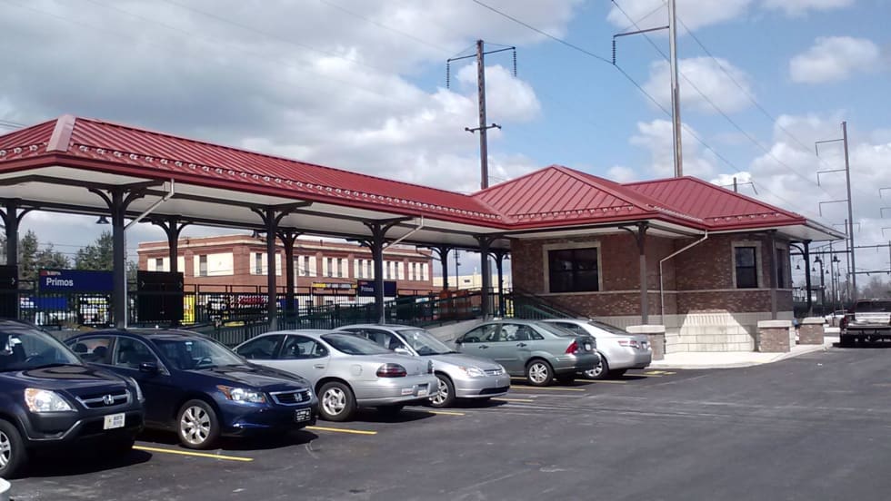 Improvements to the Primos station include a new station building; installation of a "kiss and ride" drop-off area; Americans with Disabilities Act accessible high-level platforms on the inbound and outbound sides of the station; increased parking; and newly landscaped areas.