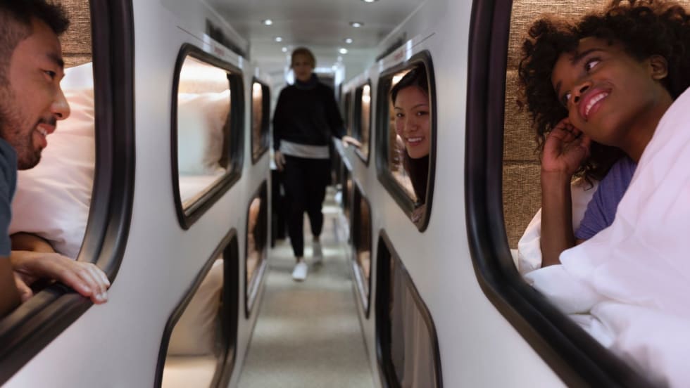 The Snoozeliner features 14 sleep pods and services designed to allow travelers to rest while they travel.