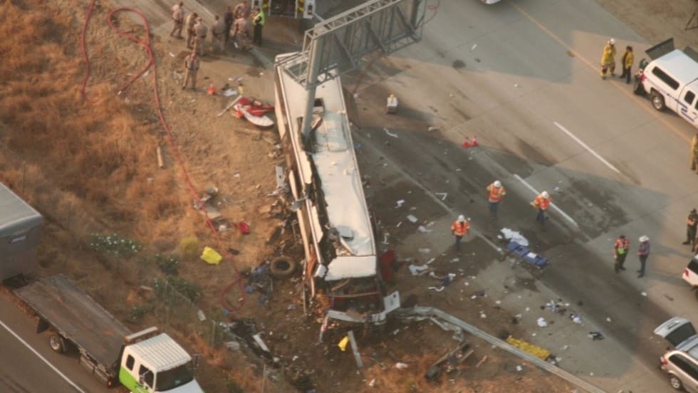 A motorcoach operated by Fresno-based Autobuses Coordinados USA Inc., traveling from Los Angeles to Modesto on State Route 99, drifted out of its travel lanes, striking a barrier system and a highway signpost shortly after 3 a.m., Aug. 2, 2016, near Livingston, Calif.