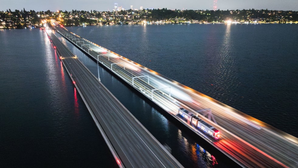 The first Sound Transit Link light rail vehicle crossed the I-90 floating bridge under its own power, enabling the start of a series of tests to prepare for the opening of the full 2 Line in early 2026.