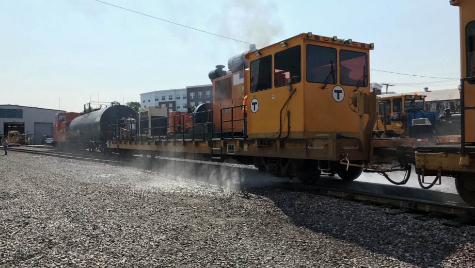 A specialized Metro-North work train sprays water at high pressure, and specially equipped highway/rail trucks use rail scrubbers to remove crushed leaf residue from the tracks.
