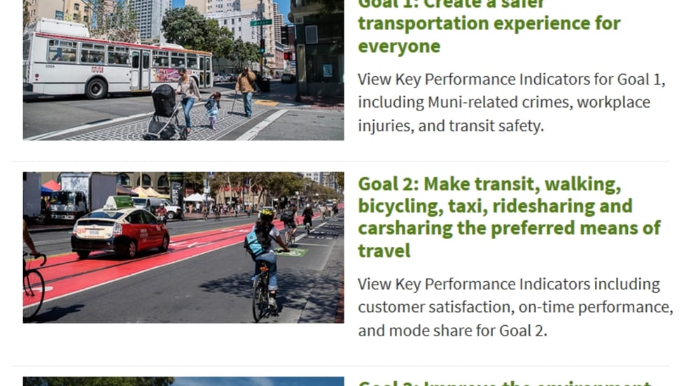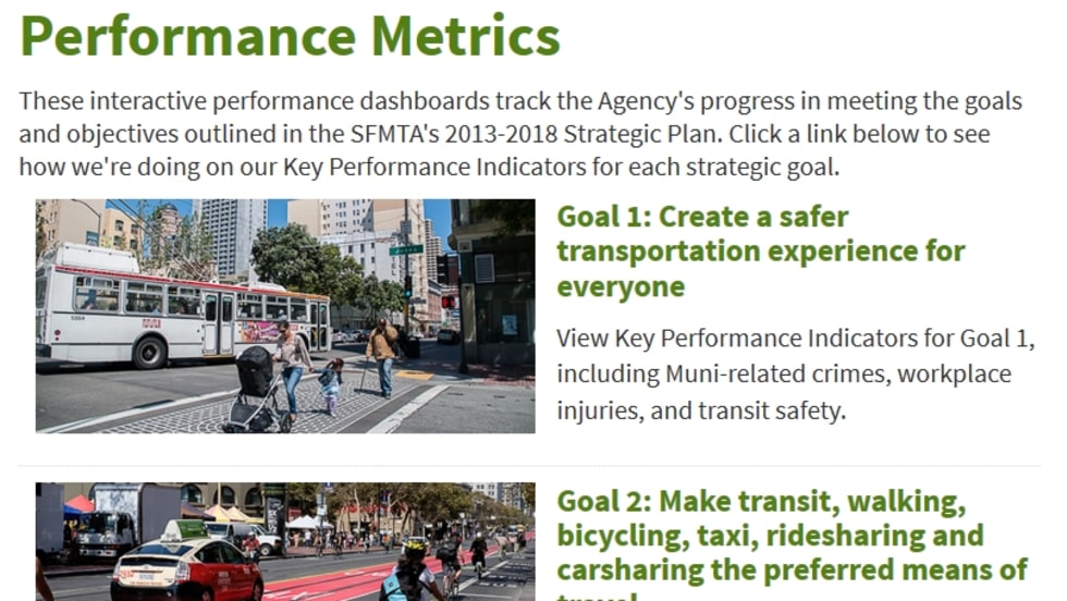 The site contains results from 13 key areas, including the percentage of on-time performance, mode share, crime stats, the agency’s carbon footprint, collision data and other information aligned with the SFMTA’s strategic plan.