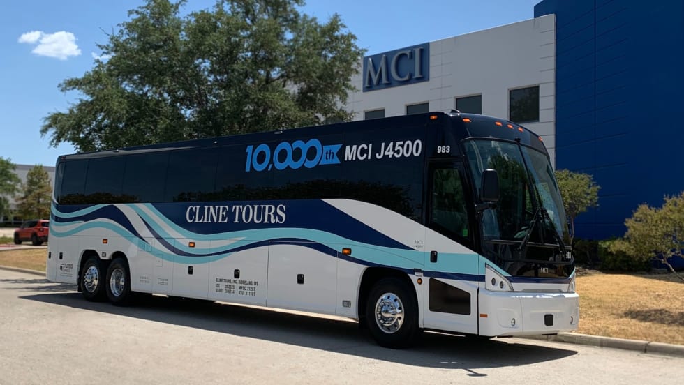 For its newest luxury J4500 coaches, Cline Tours selected the optional 360-degree cameras for a bird’s eye view around the coach and the RGB variable lighting package offering programable interior color options.